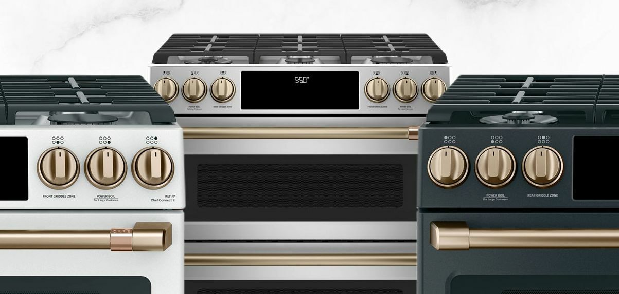 Café matte white appliances come standard with brushed bronze hardware, while Café matte black and stainless appliances feature brushed stainless hardware